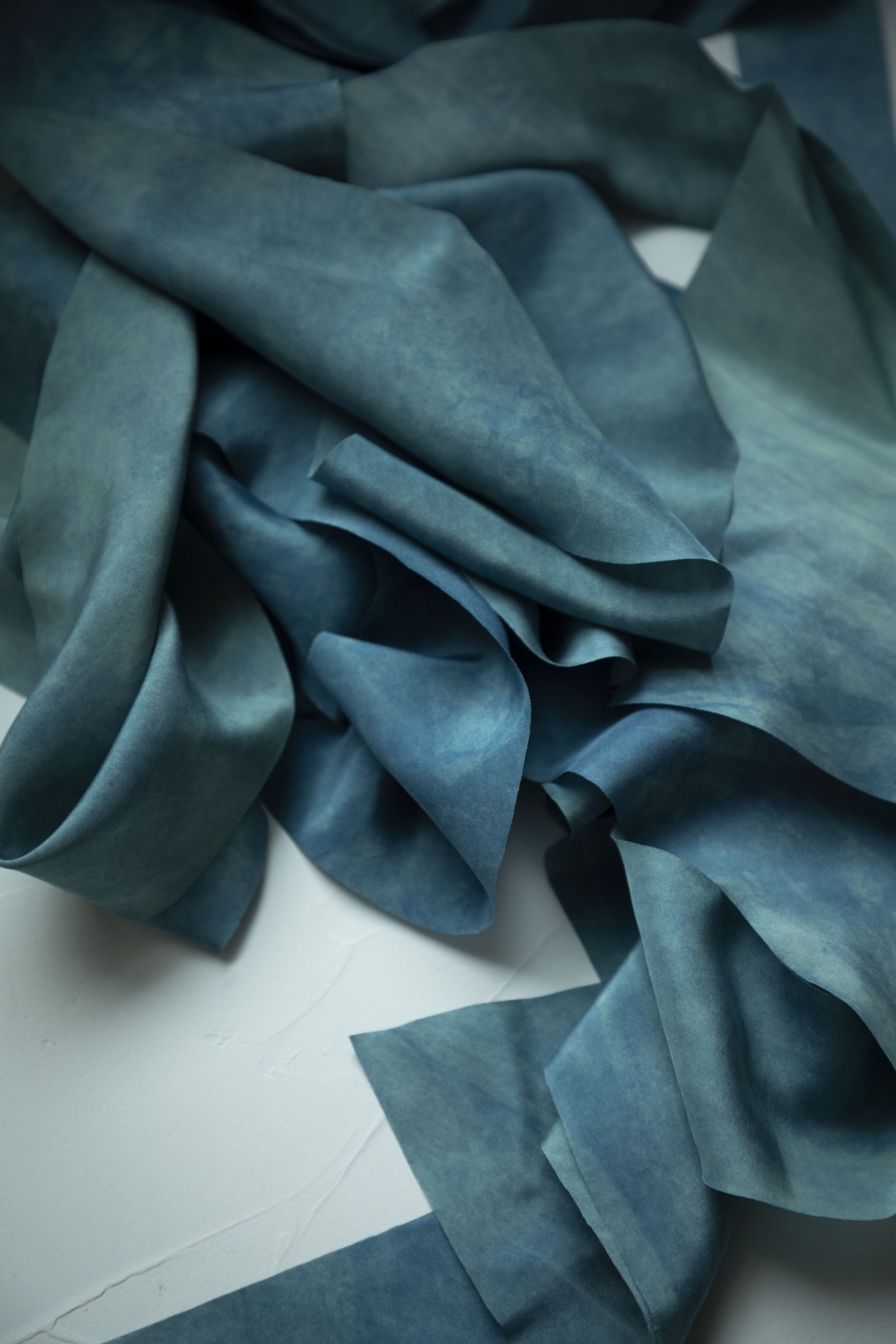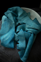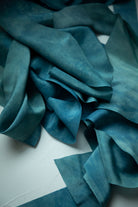 COLOR STORY: California Dreamin' is the color of a memory—a sun-drenched vision of waves crashing along the coast. It begins with silk resting in a dye bath of chlorophyllin, a pigment extracted from dark, leafy greens. Once a rich teal-green base is achieved, the silk is dipped into our organic indigo vat, where the magic of transformation unfolds.