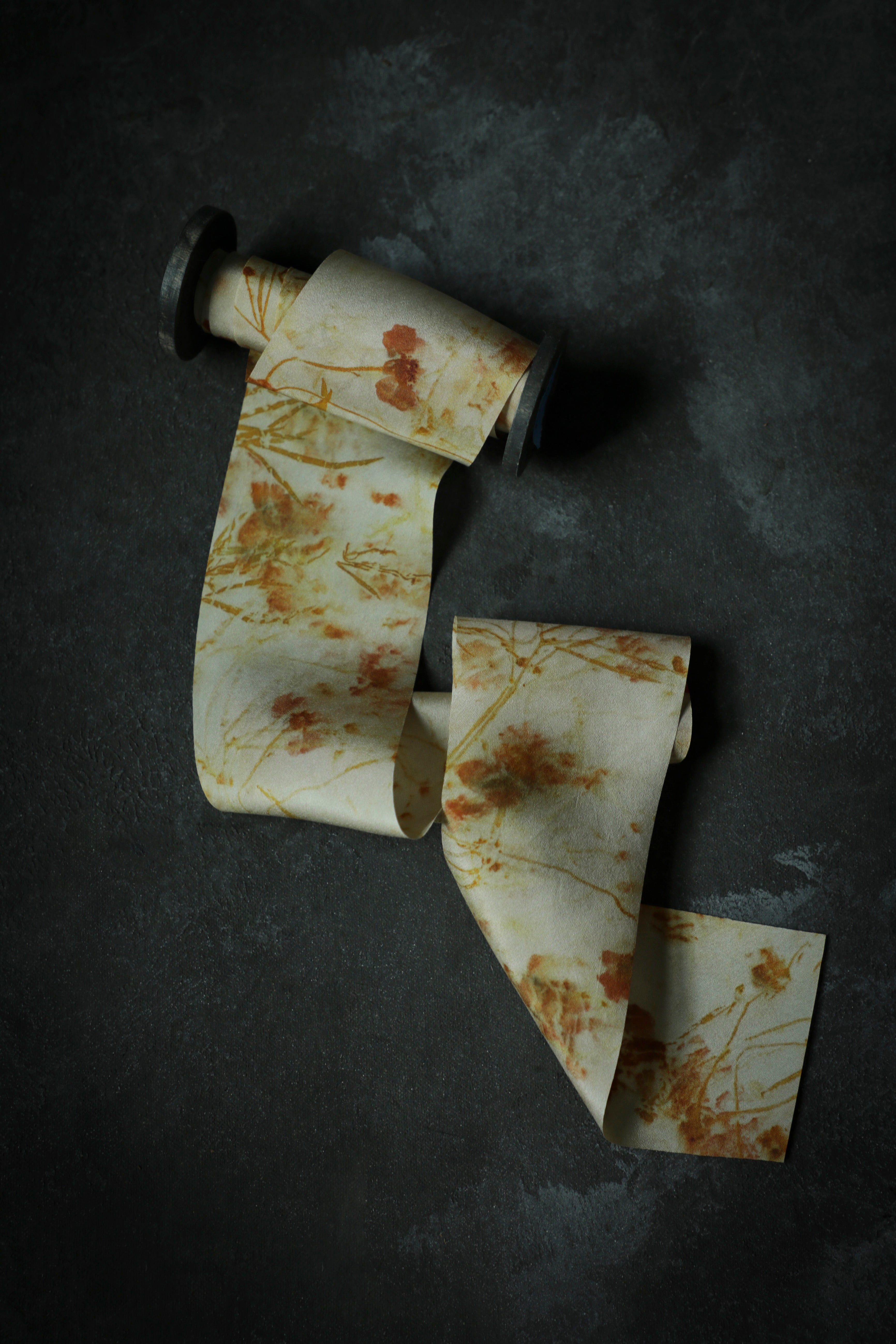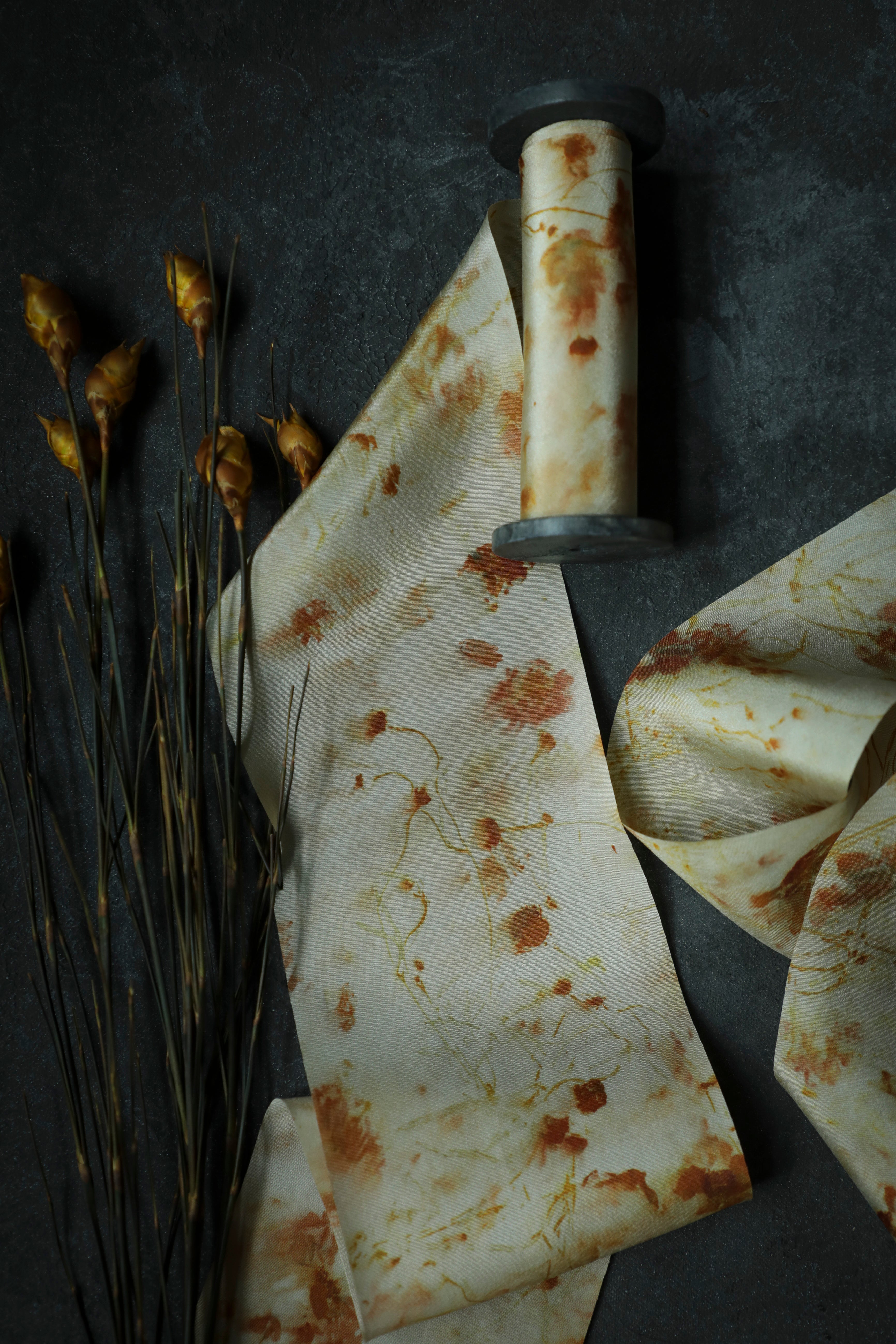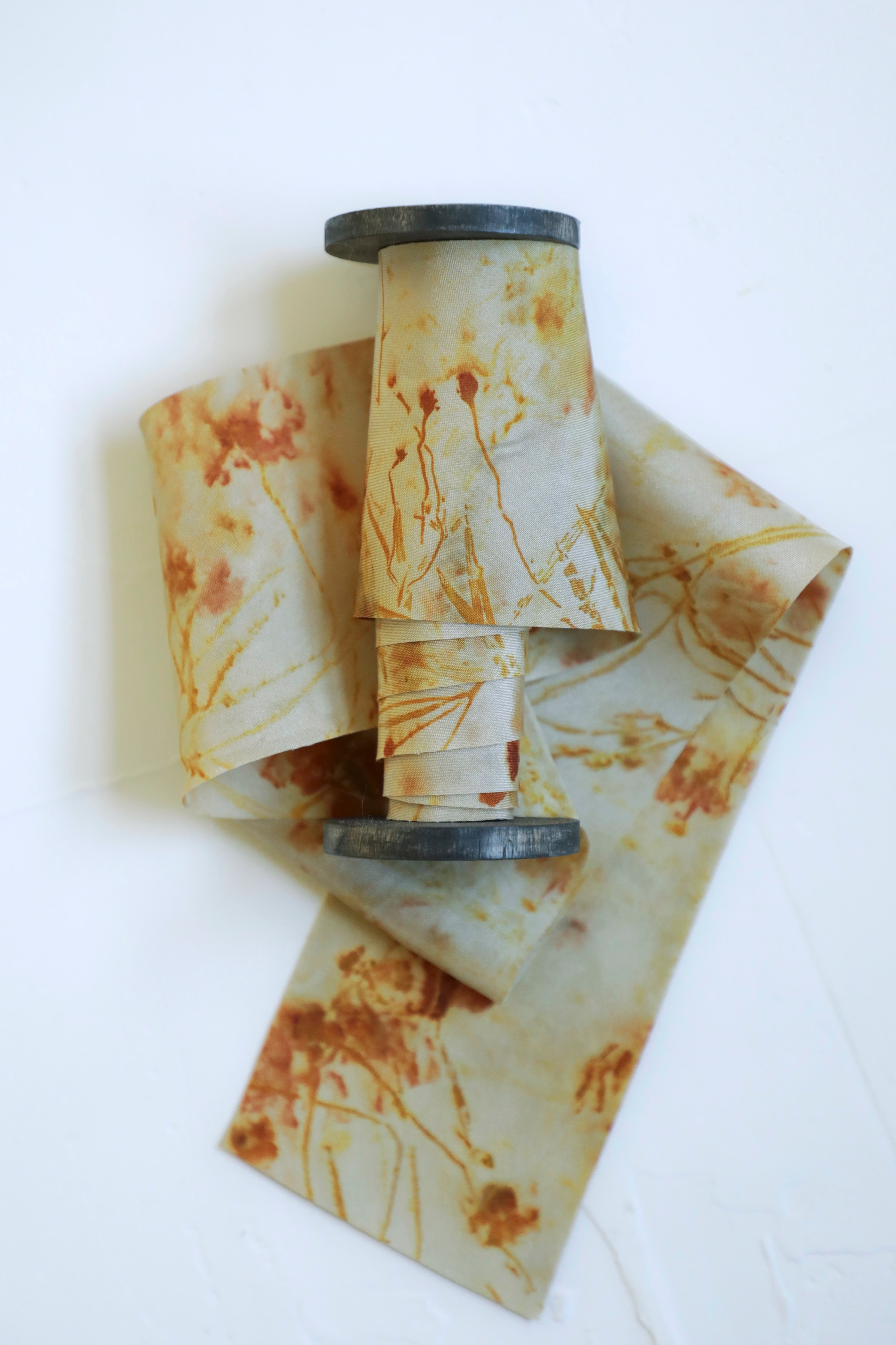 Original eco-print silk ribbons are a luxurious choice for high-end, artistic applications. Most popularly, they are used as a personal expression on bridal bouquets, adding a one-of-a-kind, nature-inspired touch to a bride’s special day. In the world of fashion, these ribbons elevate custom couture designs, serving as a sustainable fashion statement in trims for dresses, jackets, and other bespoke creations. Bespoke milliners also adore these ribbons, incorporating them into hat bands and bows to craft truly unique headwear. Beyond wearable art, our original eco-print silk ribbons have found their place framed on walls, showcasing the allure of their abstract patterns and natural hues. Each ribbon is a testament to craftsmanship and creativity, offering endless possibilities for those who value art and nature.