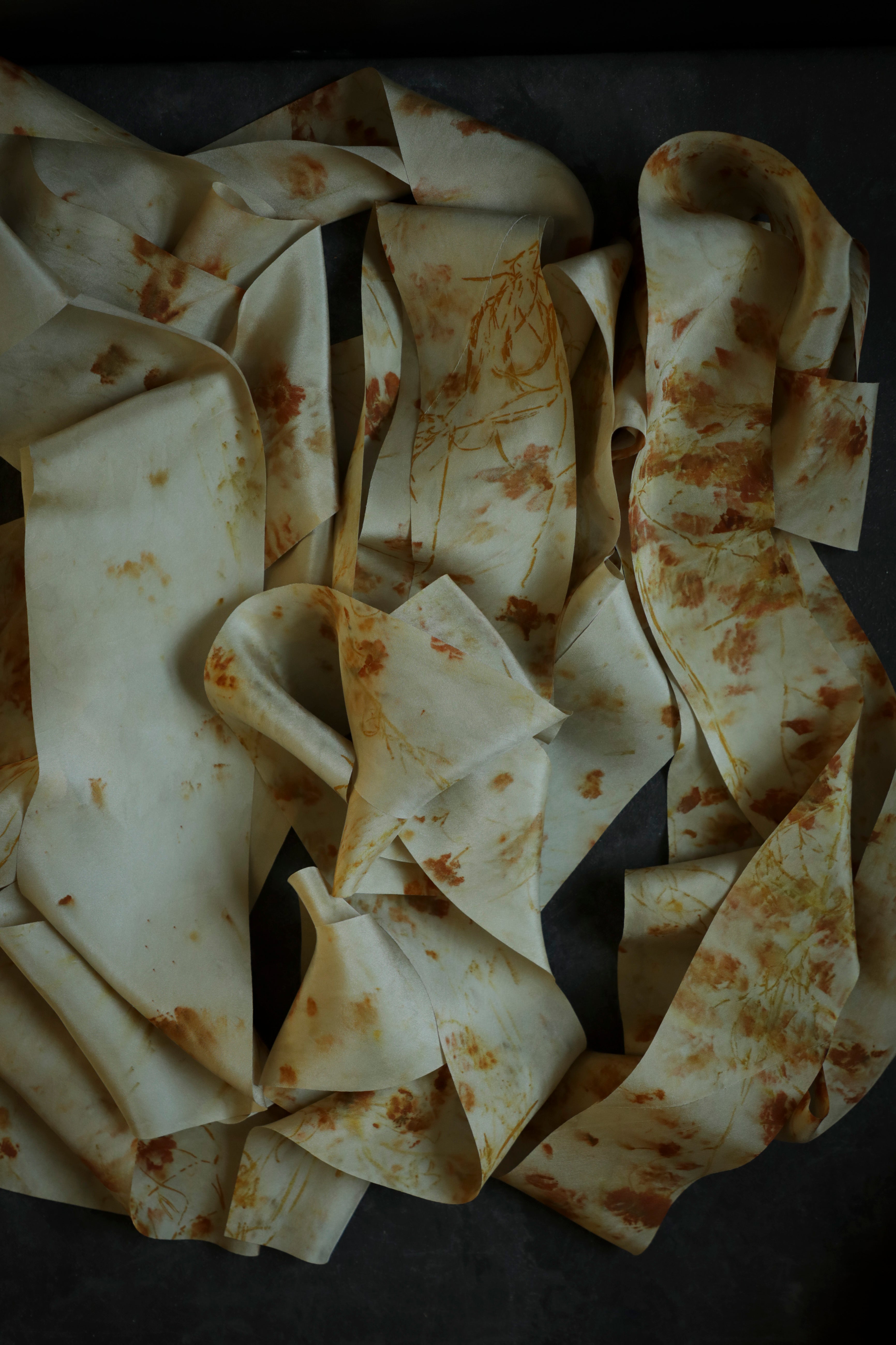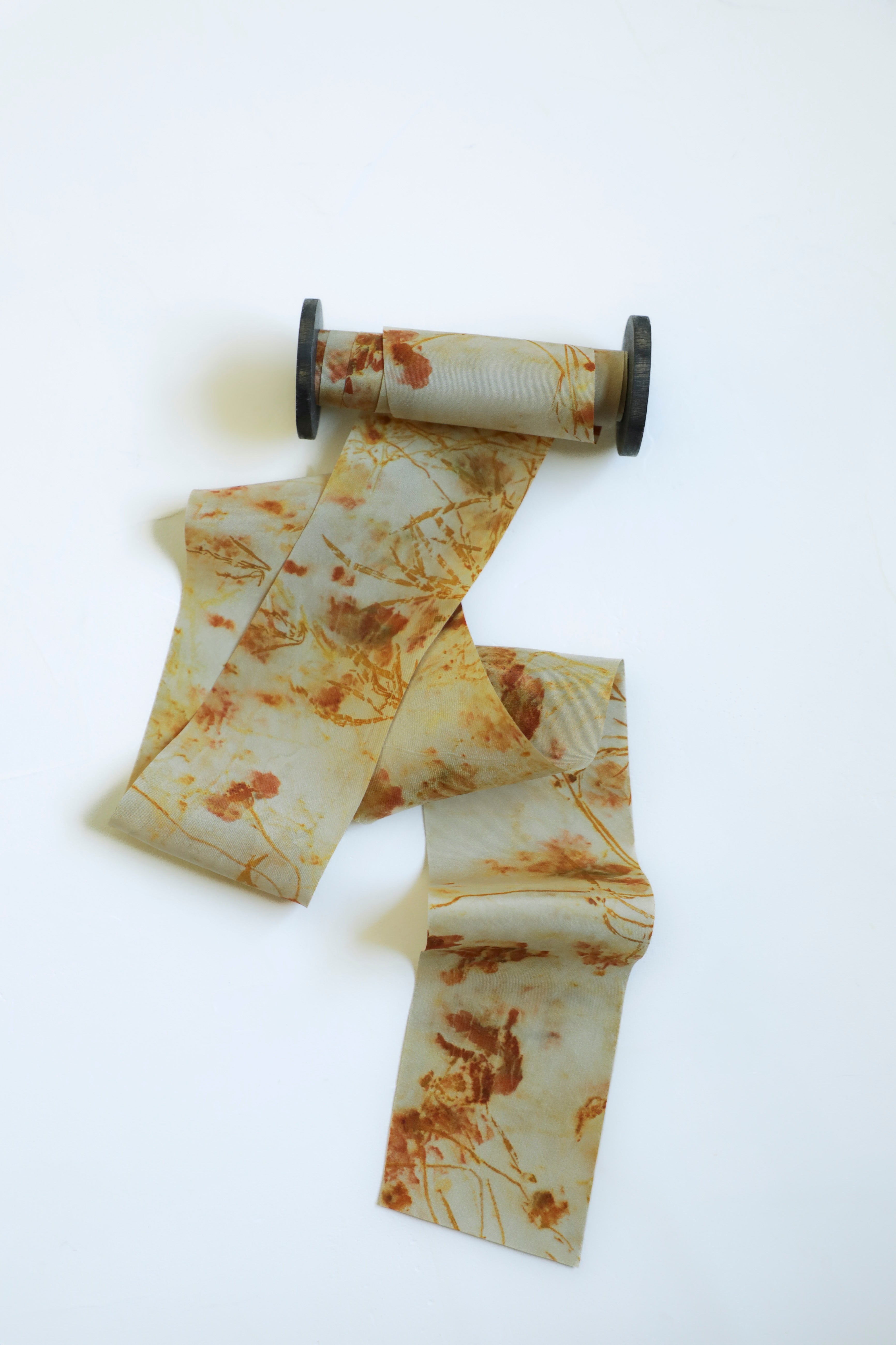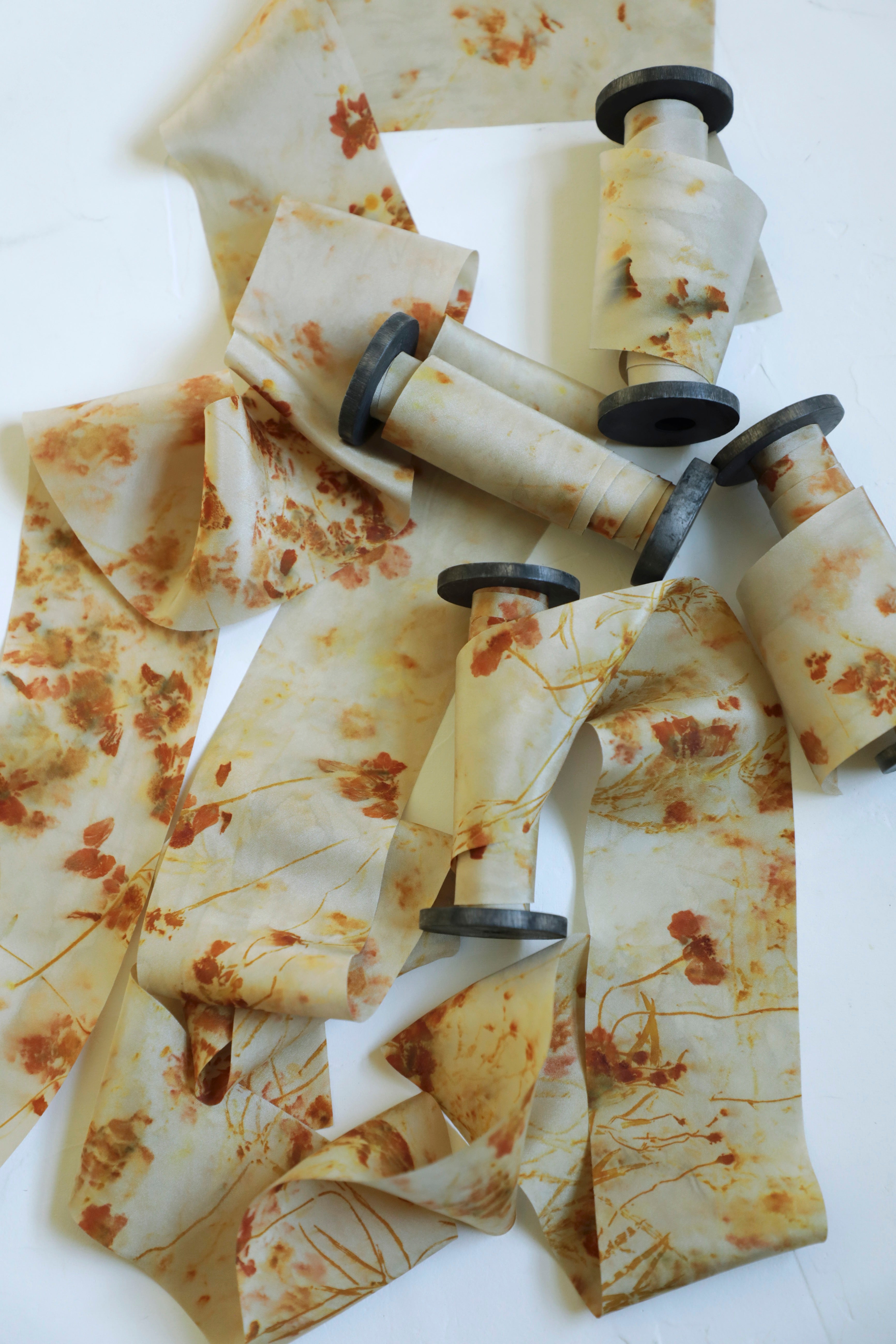 Each ribbon is a unique expression of this botanical process. Some feature an abundance of floral prints, while others have moments of open space that highlight the bursts of color.