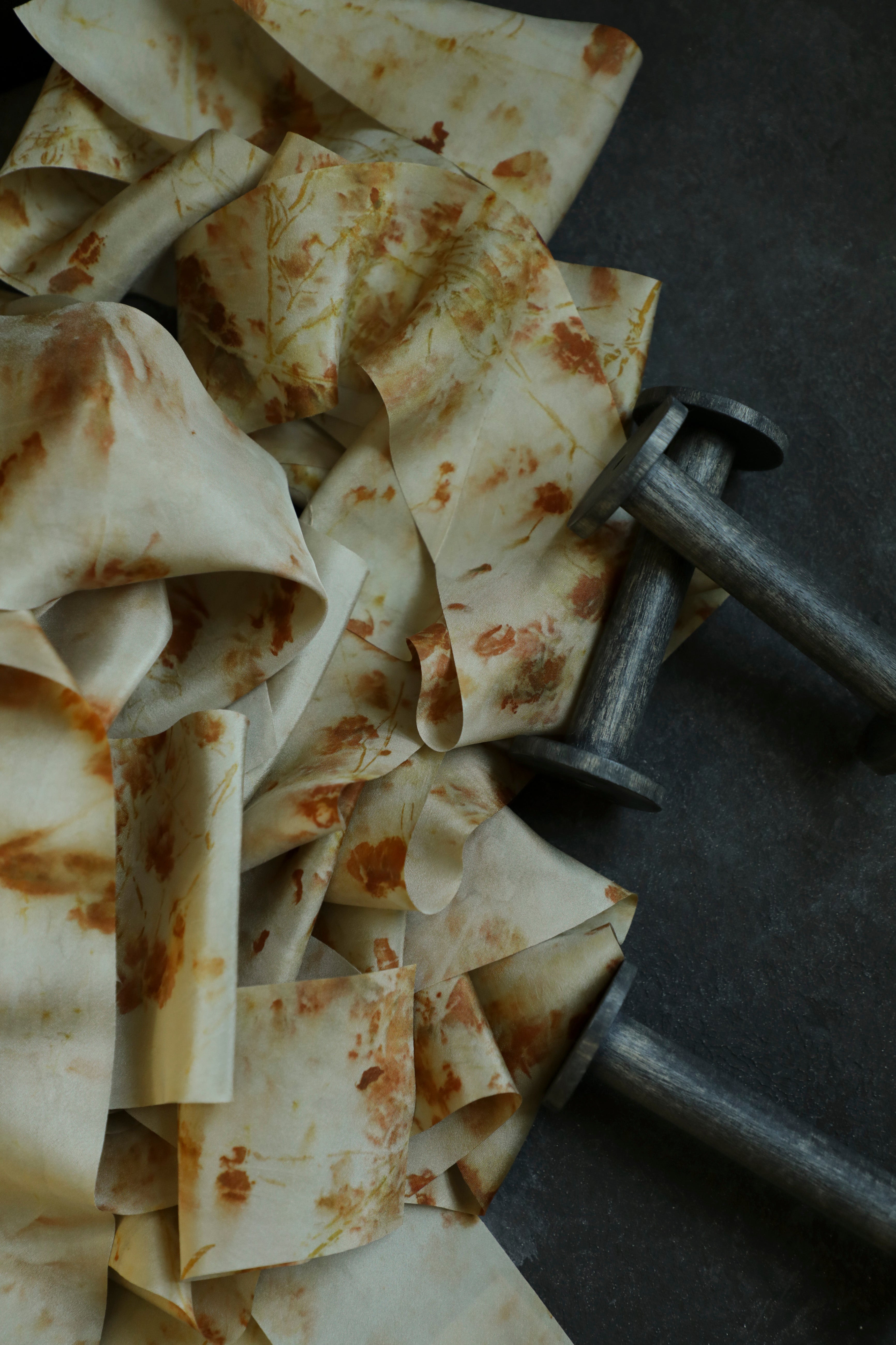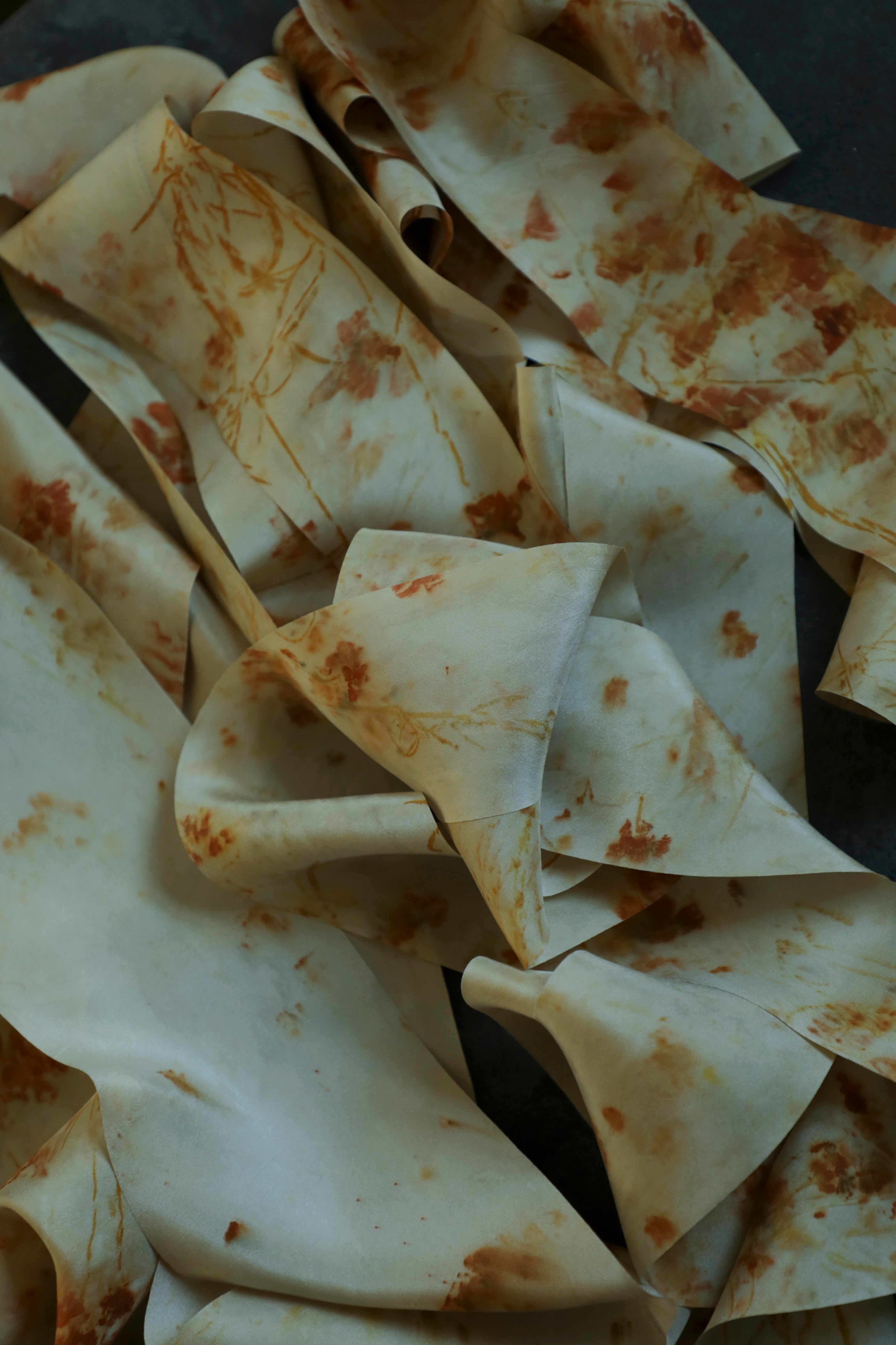 The silk is carefully steeped and prepared, awaiting its transformation. Petal by petal, Shellie arranges her findings, each placement as intentional as a brushstroke. With some areas tightly bound and others left loose, the silk is rolled into bundles and gently steamed, coaxing the natural pigments to seep and bloom across the fabric. The result is a kaleidoscope of abstract markings and hues, blending as effortlessly as the colors of a sunset or the shifting tones of a forest floor.