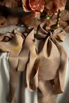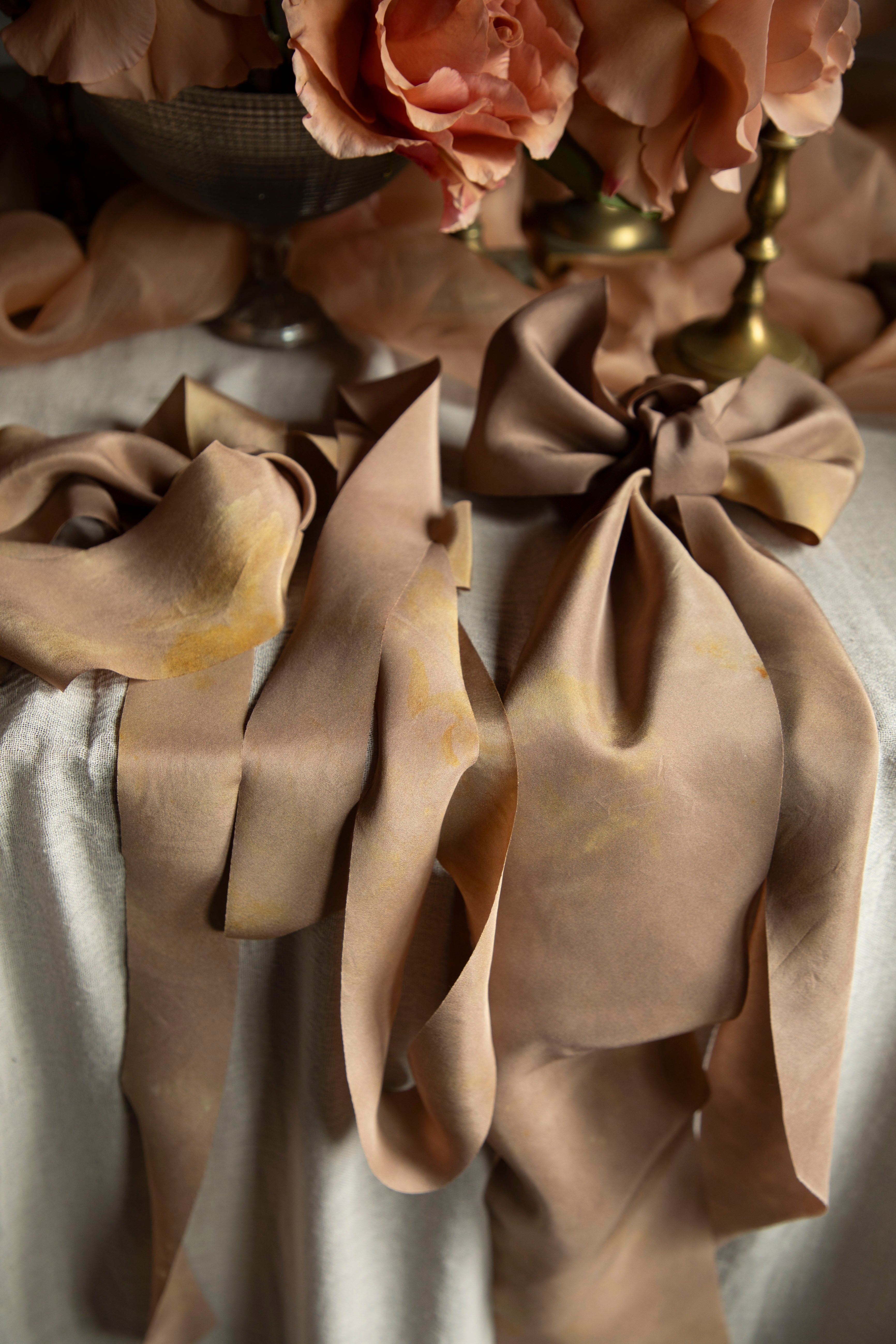 CLASSIC, SATIN, SHEER SILK RIBBONS: Our ribbons are thoughtfully crafted with longevity in mind, designed to be cherished as keepsakes or used and reused for years to come. If cleaning is necessary, gently hand-wash in cold water using a mild, pH-neutral natural laundry soap. Plant dyes are "living" colors that can be shifted by chemicals and drastic changes in pH. Avoid wringing or twisting; instead, press out excess water with a clean towel. Lay flat or hang to air dry, keeping them away from direct sunlight to preserve their rich, natural hues. For a smooth finish, use a medium-heat iron or steamer.