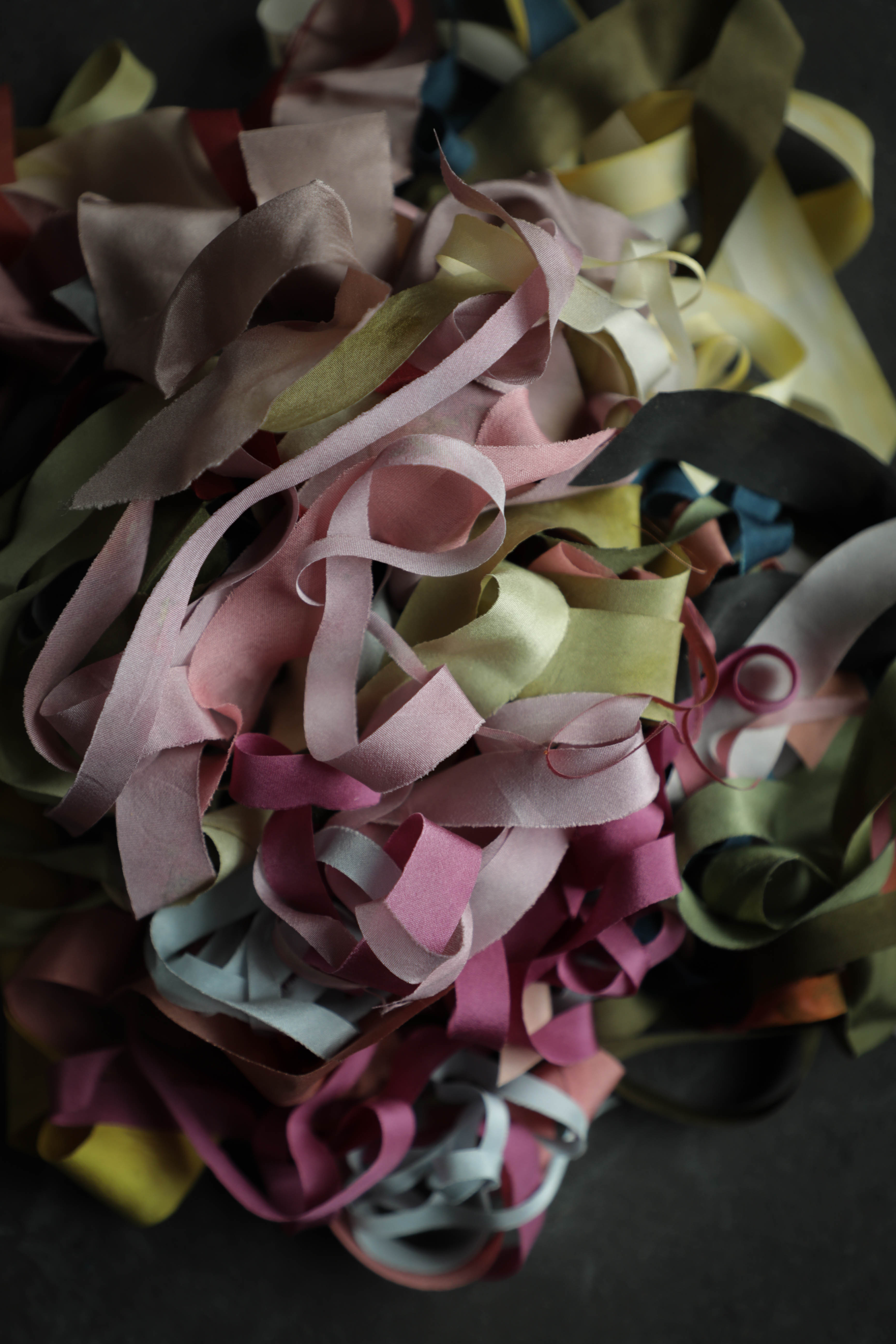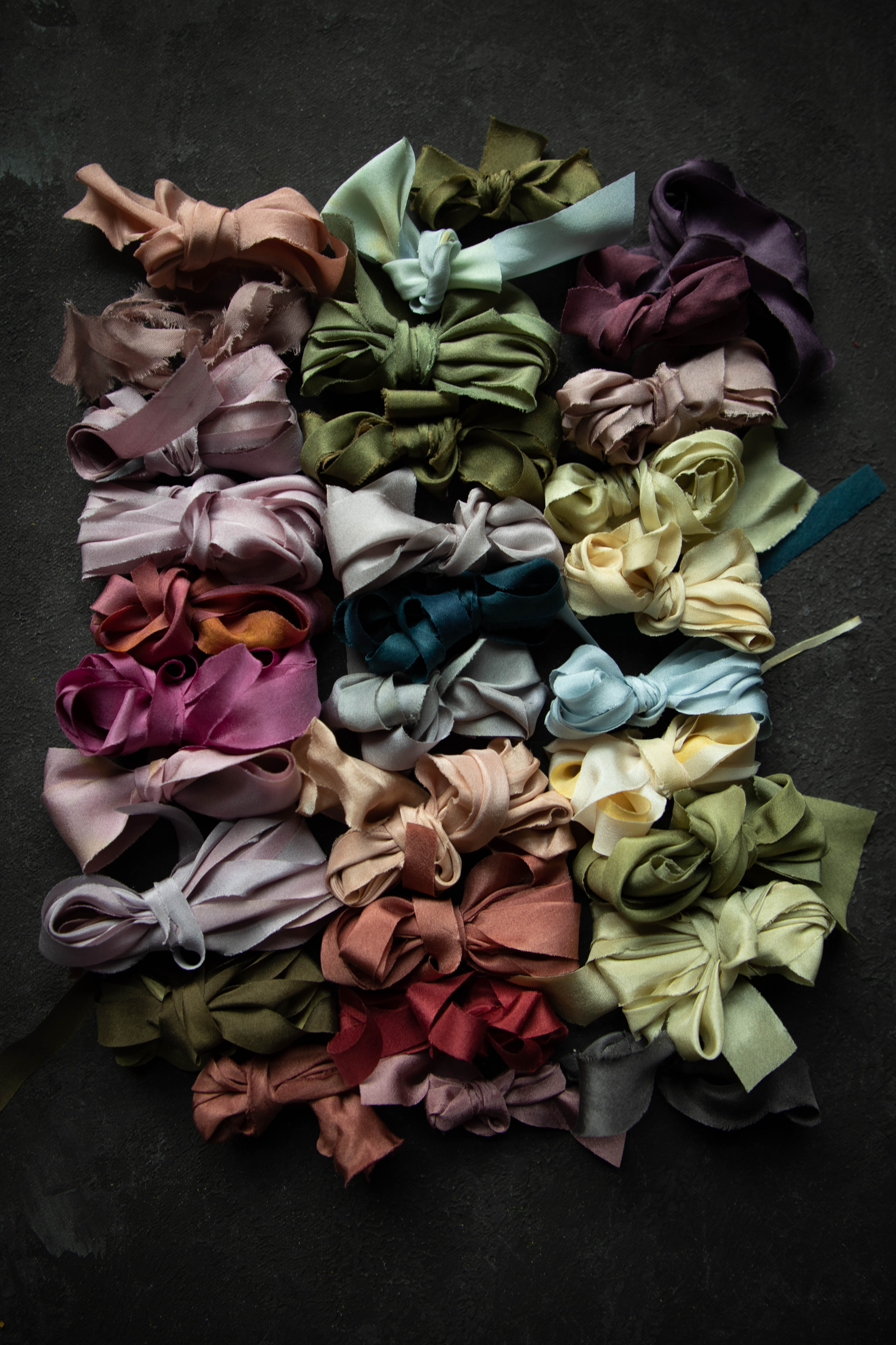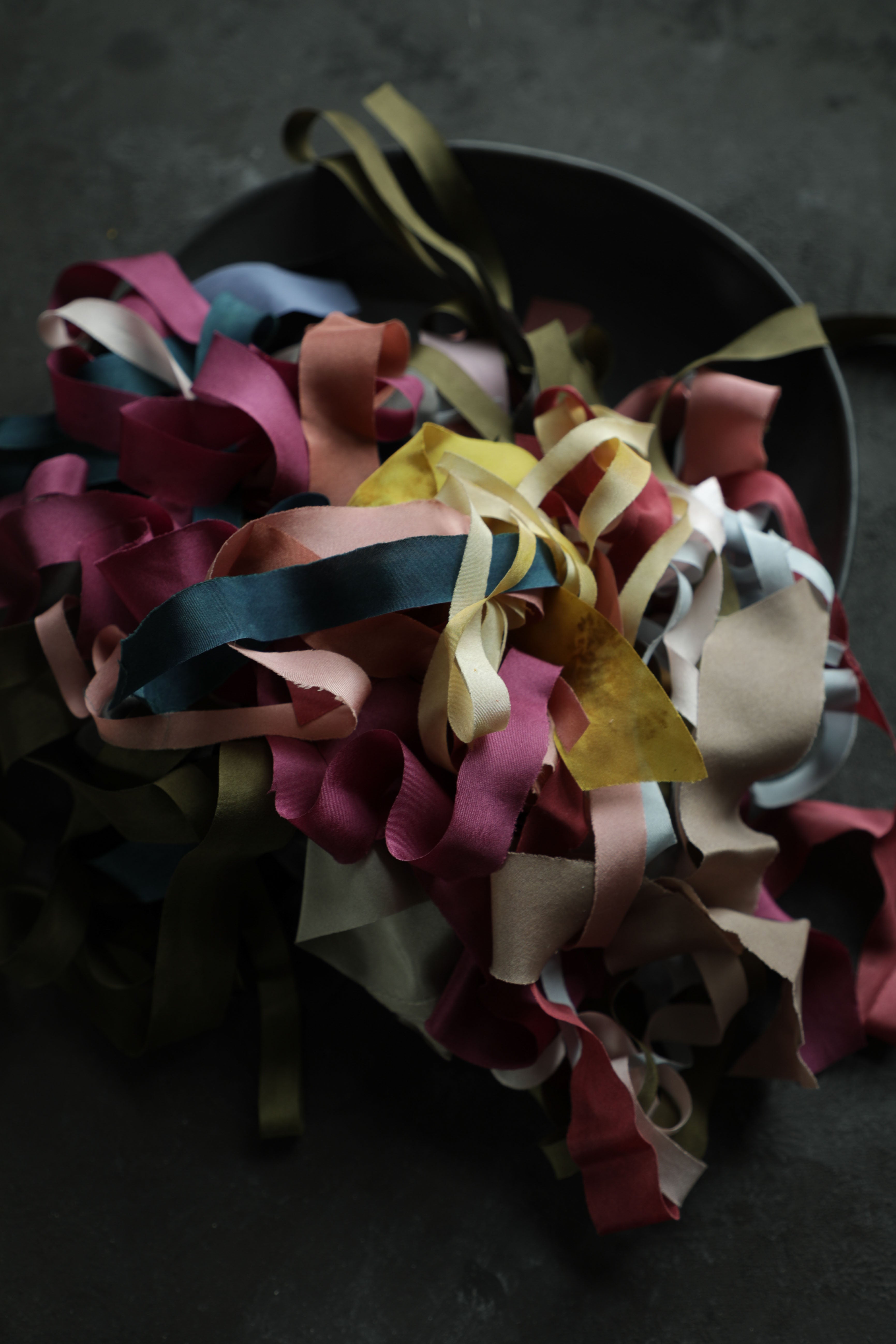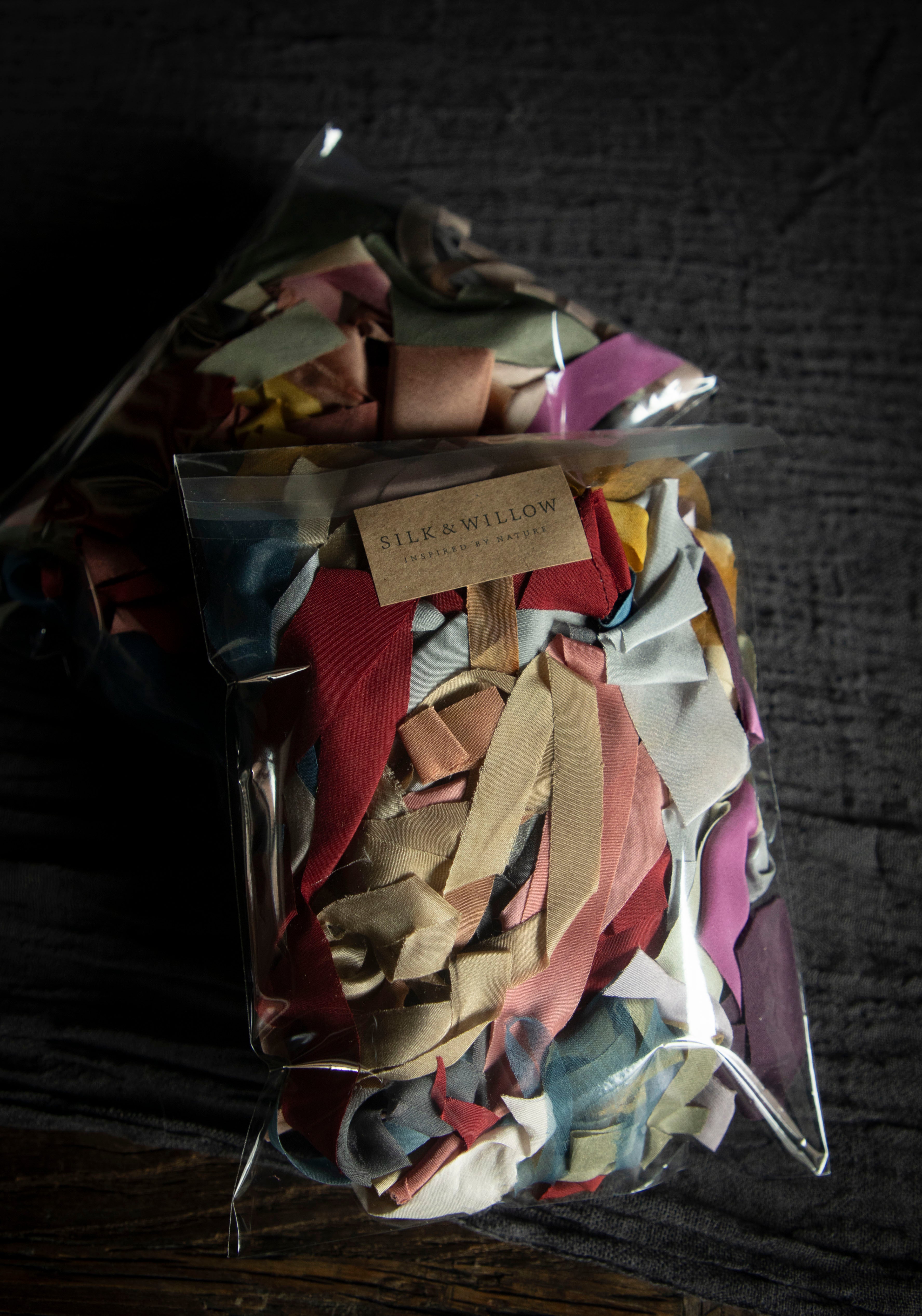 WHAT'S INCLUDED / Each ribbon bundle comes with an assortment of naturally dyed ribbon pieces. The ribbon sizes vary, some ribbons are very thin cut-offs, and others are an inch or more in width, but most are in the 3/4 inch range. The length of each ribbon varies; most pieces are 1/2 yard or more, some are over a yard long, and shorter pieces are included as well. PIECES SHORTER THAN 6 inches ARE NOT INCLUDED IN THE OVERALL WEIGHT (they are extras that are added in for free). Note: these ribbons are remnants with irregular sizing, edging, and frays. These are not intended as bouquet ribbons. The images represent a sample collection of colors that may be included, colors vary in each pack.