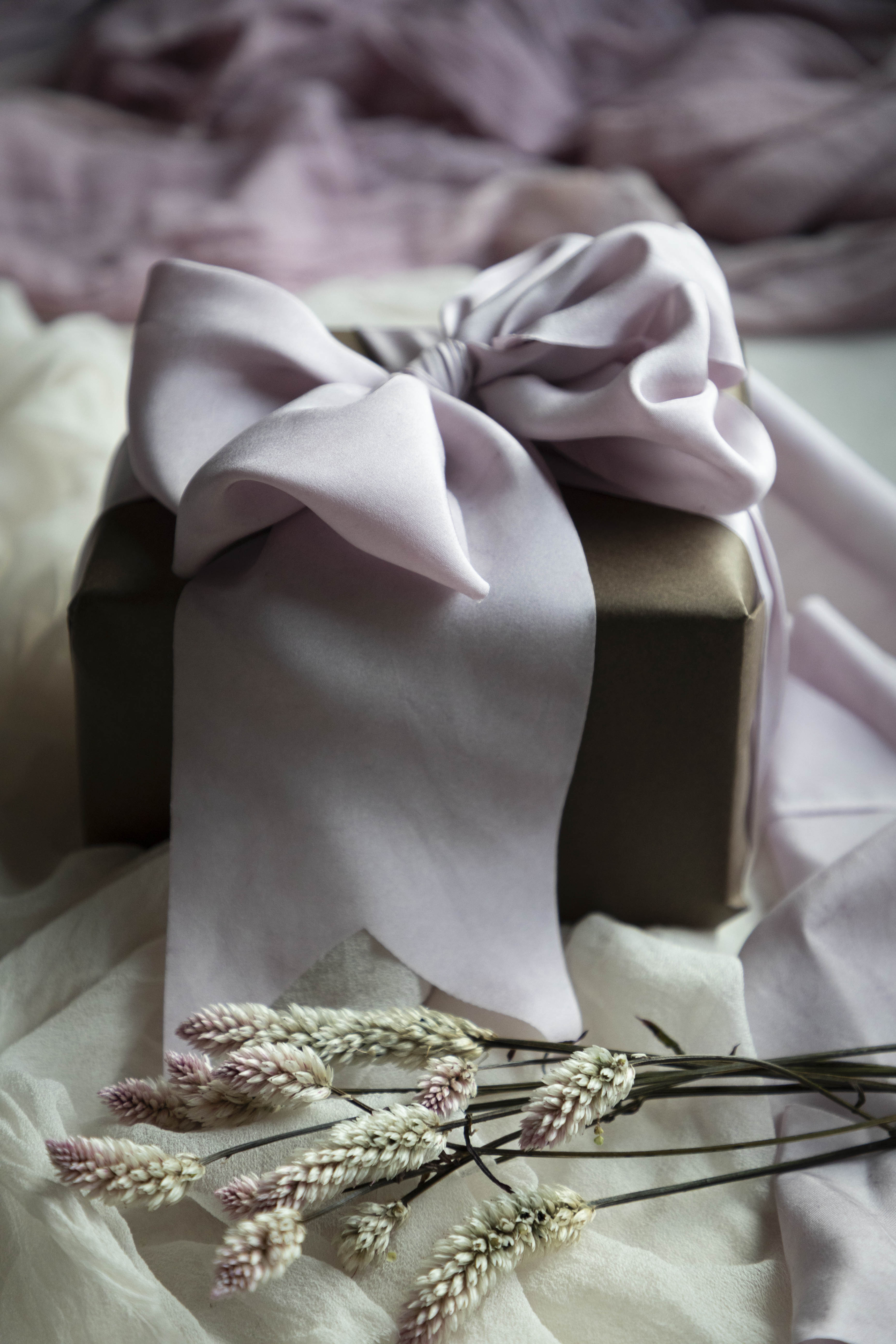 COLOR STORY: a delicate yet captivating dusty lilac shade. With its subtle gray undertone, this ribbon possesses an understated elegance. The speckles of color add depth and a touch of uniqueness to this special hue.