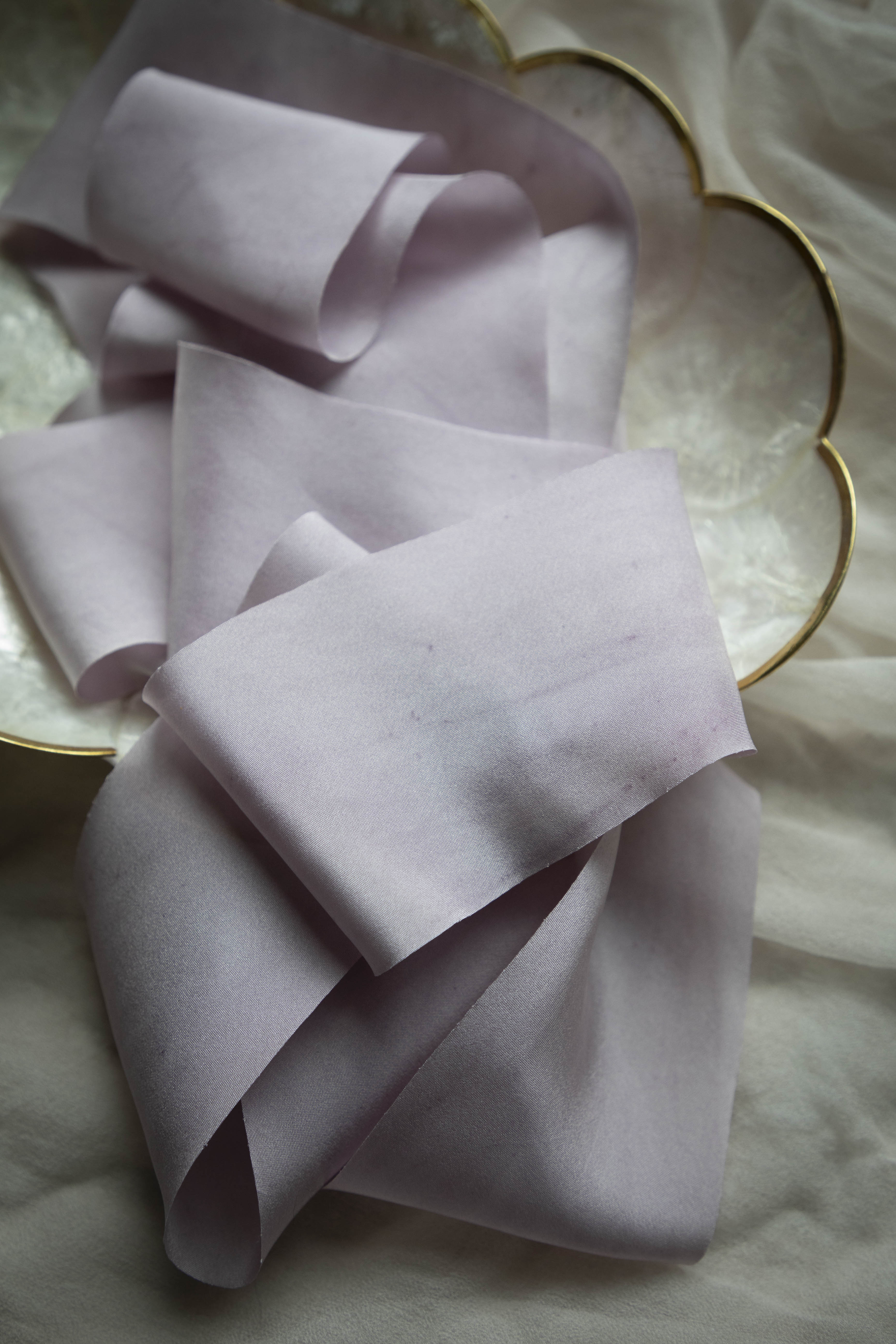 CLASSIC, SATIN, SHEER SILK RIBBONS: Our ribbons are thoughtfully crafted with longevity in mind, designed to be cherished as keepsakes or used and reused for years to come. If cleaning is necessary, gently hand-wash in cold water using a mild, pH-neutral natural laundry soap. Plant dyes are "living" colors that can be shifted by chemicals and drastic changes in pH. Avoid wringing or twisting; instead, press out excess water with a clean towel. Lay flat or hang to air dry, keeping them away from direct sunlight to preserve their rich, natural hues. For a smooth finish, use a medium-heat iron or steamer.
